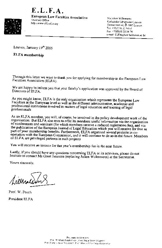 ELFA (European Law Faculties Association) - Scrisoare de intenţie