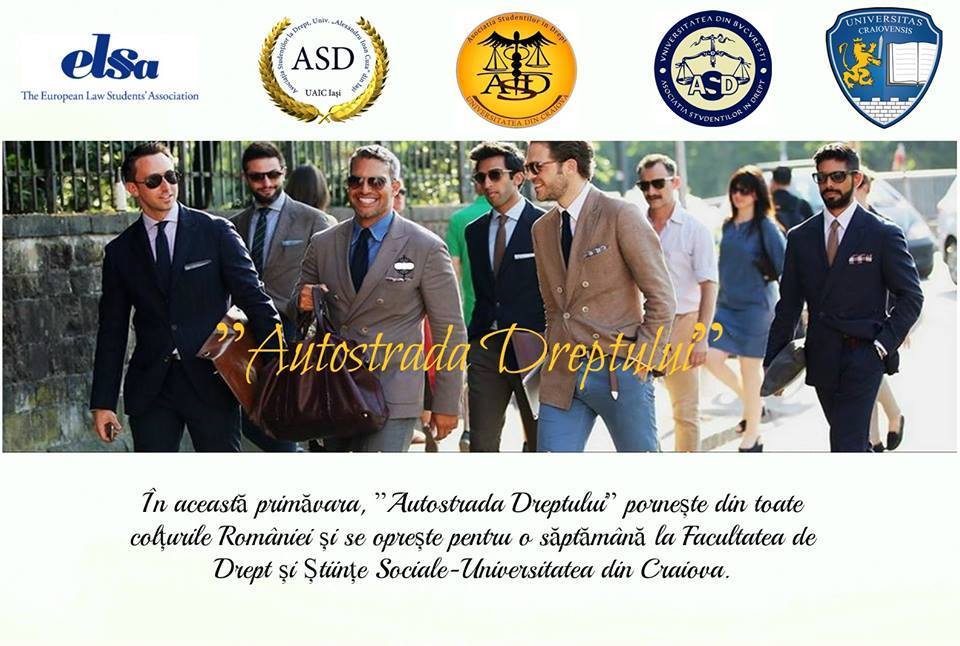 În această primăvară, Asociația Studenților în Drept din cadrul Universității din Craiova (ASD-UC) a deschis proiectul ”Autostrada Dreptului”, colaborând în perioada 20-26 cu Facultatea de Drept din București, Facultatea de Drept din Sibiu și Facultatea de Drept din Iași. În cadrul proiectului, studenții participanți au avut ocazia de a petrece o săptămână în Campusul Facultății de Drept și Științe Sociale din Craiova, luând parte la diverse activități academice, culturale și de divertisment. Ideea schimbului de experință presupune atât posibilitatea participării studenților la ore de curs și seminare desfășurate de către profesorii craioveni, cât și posibilitatea realizării unor activități din afara curriculumului.
